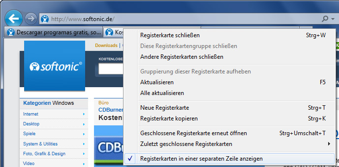 Die Tableiste von Internet Explorer 9 ist deutlich flexibler als in früheren Versionen. Wird bei vielen gleichzeitig geladenen Seiten der Platz knapp, holt man die Leiste per Mausklick unter die Adress- und Suchleiste. Per Drag&Drop zieht man einzelne Seiten aus dem Browser einfach in ein Extra-Fenster.