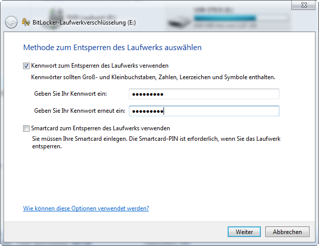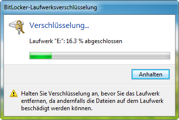 Nach Eingabe eines Passworts oder durch Zuweisung einer Sicherheits-Chipkarte beginnt BitLocker To Go umgehend mit der Verschlüsselung.